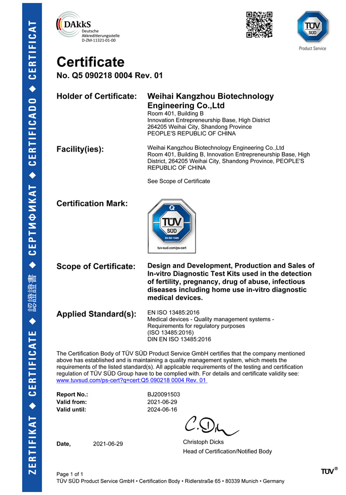? ? ?威海康州生物工程有限公司成立于2013年,公司坐落于風景秀麗的海濱小城——威海市??抵萆锸羌邪l、生產和銷售于一體的生物科技公司,與威海哈爾濱工業大學合作研發團隊,擁有先進的科研基地及生產基地。主要從事快速診斷檢測產品的研發、生產、銷售。產品涵蓋:生育檢測、藥物濫用檢測、農藥殘留檢測以及其他臨床診斷檢測等。公司自主研發生產得早早孕試紙,排卵檢測試紙,毒品檢測及疾病檢測等醫用產品,經過歐盟認證,產品質量穩定,值得信賴。